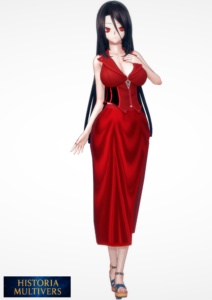 Tenue rouge éclatante : robe moulante avec corset, style femme fatale assumée.