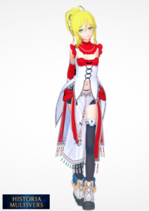 | Signes distinctifs | Cheveux blonds attachés en queue haute, hérités de sa mère, accentuant son dynamisme. Yeux bleus expressifs, reflets de sa vitalité et de son héritage héroïque. Tenue rouge et blanche richement décorée, avec des ornements pendants rappelant son statut et ses origines. Chakram magiques comme arme principale, signature familiale et hommage à sa mère. Posture confiante et détendue, typique des jeunes combattantes idéalistes. Aura lumineuse qui trahit une influence angélique / sacrée héritée de ses parents Mélange de grâce et de force : douceur dans son apparence, mais efficacité en combat.