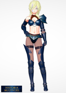| Signes distinctifs | Cheveux blonds coupés courts et légèrement décoiffés, accentuant son côté rebelle. Yeux clairs perçants, souvent durs, reflétant sa détermination et son tempérament de rivale. Visage marquée de tatouages → Trace de son pacte avec Cendrius. Armure sombre minimaliste (bleu nuit/acier), privilégiant la mobilité plutôt que la protection. Silhouette athlétique avec ventre et bras musclés visibles, témoins d’un entraînement intense. Aura martiale : elle dégage une intensité constante, comme prête à défier quiconque.