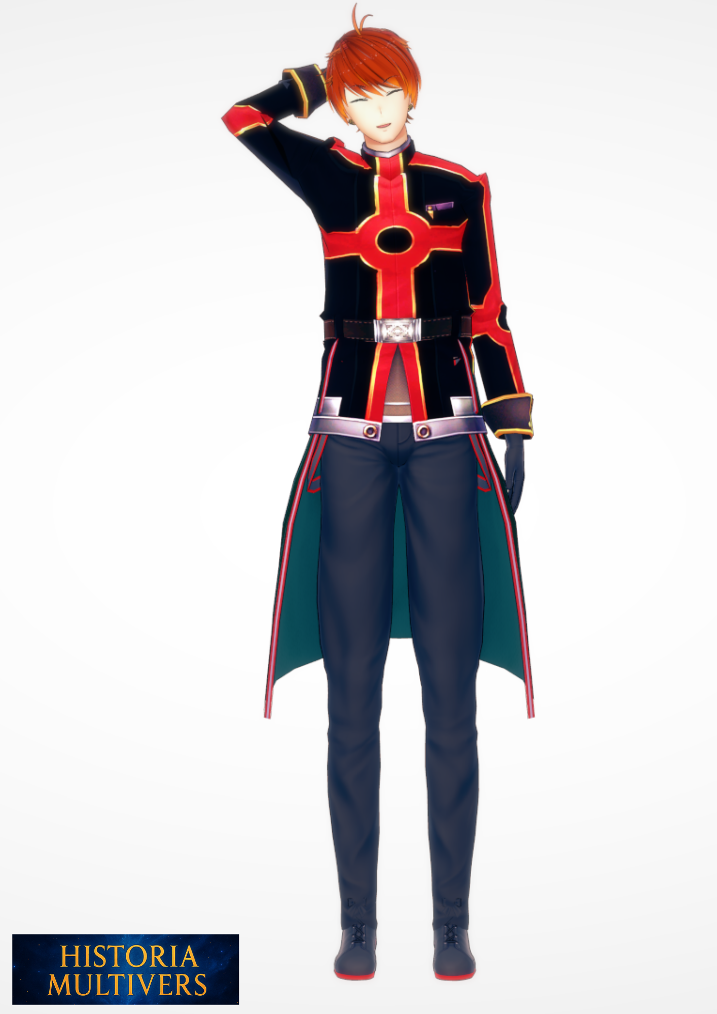 Uniforme noir rehaussé de liserés rouges formant un motif circulaire au thorax ; doublure vert‑émeraude visible sur les pans.