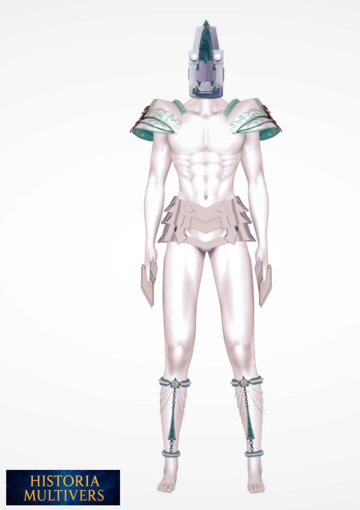 | Signes distinctifs | Tête minérale : non pas un masque, mais sa véritable tête, ressemblant à une gargouille, mélange de félin, de reptile et de pierre vivante. Yeux lumineux, perçants, semblant sonder les âmes. Peau pâle et luisante, rappelant la pierre polie, avec veines bleutées. Épaulettes ornementales aux motifs gravés, renforçant son apparence divine. Plastron réduit : torse largement nu, soulignant sa musculature de marbre. Jambières décorées de chaînes et gemmes, donnant à ses jambes une prestance cérémonielle. Mains griffues, plus proches de la créature mythique que de l’humain. Présence écrasante, inspirant crainte et révérence à ceux qui l’approchent.