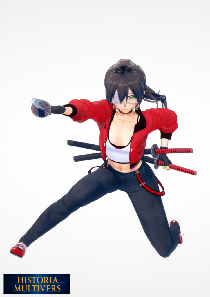 | Signes distinctifs | Cheveux noirs attachés en queue haute, accentuant son côté martial et discipliné. Œil droit couvert d’un cache-œil, signe de blessures passées. Yeux verts intenses, regard vif et calculateur. Tenue moderne adaptée au ninjutsu : veste rouge courte, brassière blanche, pantalon ajusté et baskets souples → parfait mélange de tradition et d’urbanité. Équipement : plusieurs katanas à la ceinture, en plus de petites armes dissimulées. Posture constamment prête au combat, corps bas et dynamique. Aura de discrétion et de tension, marquant son rôle de shinobi issu d’un clan ancestral.