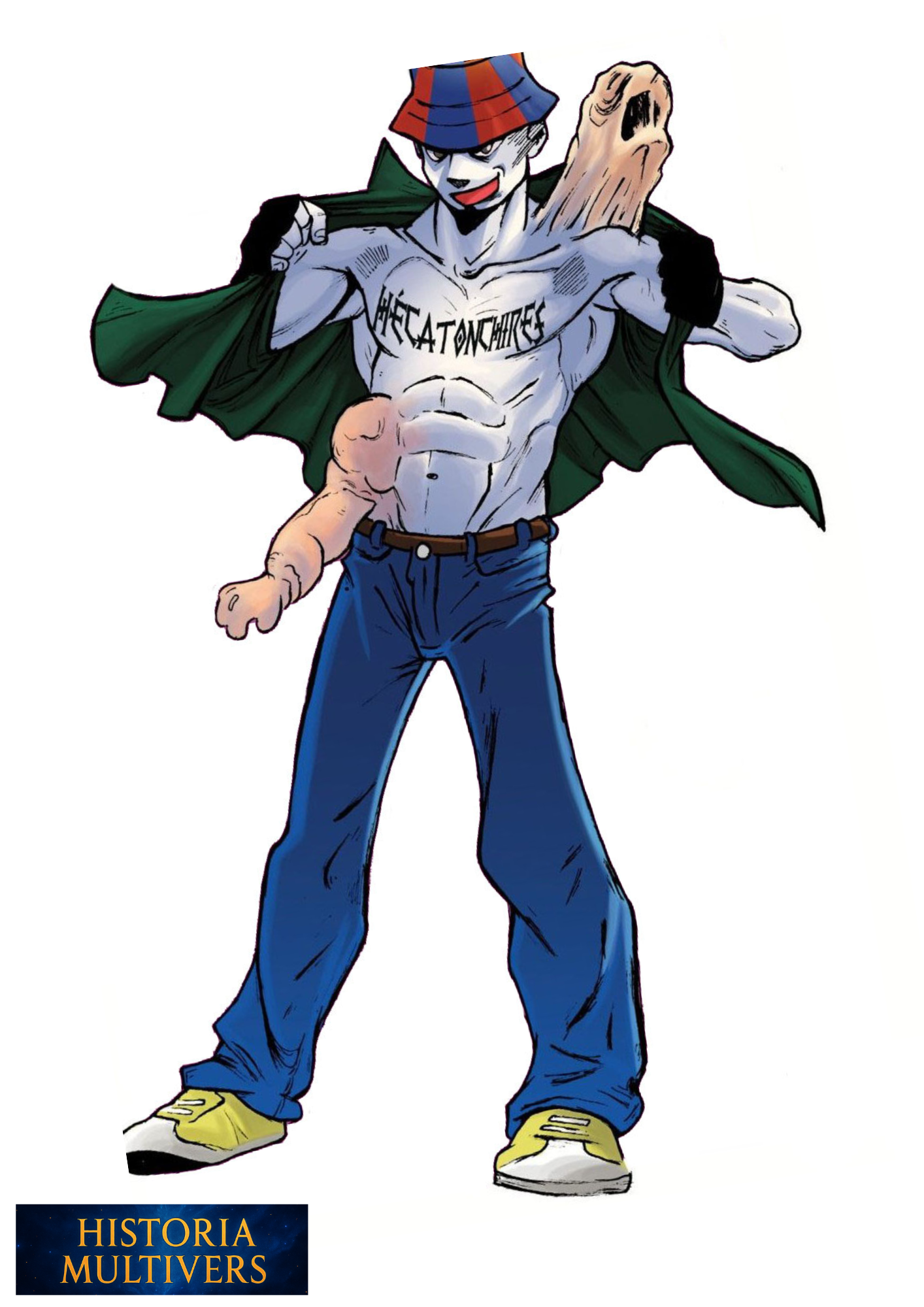 Corps pâle et musclé, Torse découvert, avec le nom de son ancien groupe, “Hécatonchires”, tatoué en lettres noires.