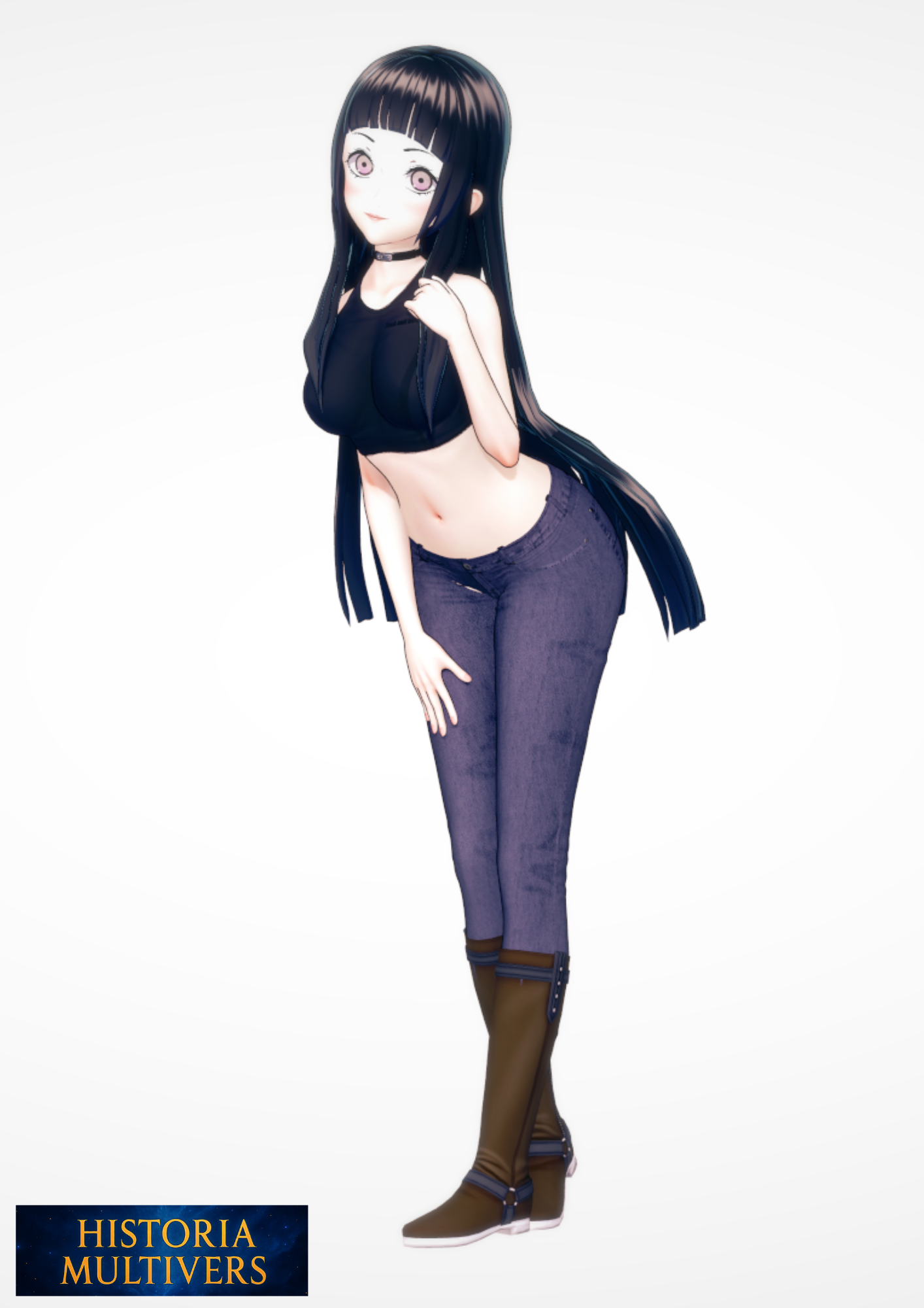 | Signes distinctifs | Cheveux noirs longs et lisses, tombant jusqu’à la taille, évoquant une beauté froide. Yeux gris, à l’éclat étrange, parfois mécaniques lorsqu’elle active ses capacités. Peau pâle, légèrement trop lisse pour paraître totalement humaine. Allure fine et souple, donnant l’impression d’une jeune femme ordinaire. Collier noir sobre, accessoire minimaliste qui souligne sa transformation d’arme à personne. Vêtements modernes (haut court, jean moulant, bottes) → dissonance volontaire entre sa vraie nature et son apparence banale. Présence fantomatique, certains ressentent encore le poids mécanique de son ancienne nature robotique.