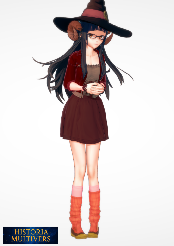| Signes distinctifs | Longs cheveux noirs coiffés sous un grand chapeau magique, qui sert de poche sans fond pour stocker ses outils et créations. Cornes recourbées sur les côtés du crâne, signe de son héritage démoniaque. Porte des lunettes rondes, accentuant son air studieux et appliqué. Style vestimentaire à la fois pratique et fantaisiste : jupe sobre, veste rouge et chaussettes épaisses colorées. Spécialiste de la forge : ses bras gardent la souplesse d’une jeune fille, mais ses mains et son regard trahissent l’expérience d’une artisanes hors pair. Pouvoir unique d’agrandissement corporel, lui permettant de devenir une véritable géante, ce qui fait d’elle une alliée redoutable autant au combat qu’en soutien. Toujours accompagnée d’un petit outillage ou d’objets enchantés de sa propre création. Caractère passionné et enflammé, d’où son nom « Infurioson », mais toujours bienveillante envers ses proches, surtout Anzu.