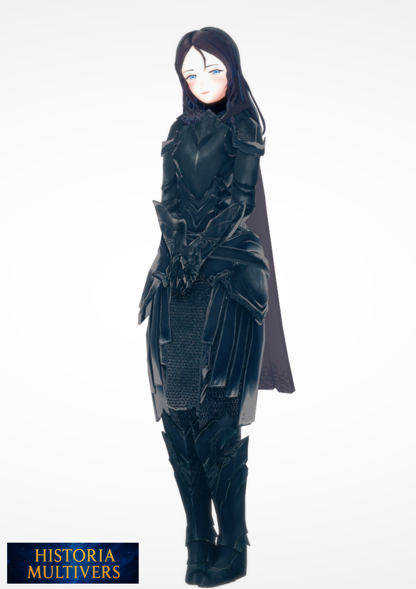 | Signes distinctifs | Longs cheveux noirs légèrement ondulés, contrastant avec son teint clair. Yeux d’un bleu profond qui peuvent virer à une teinte argentée. Armure noire élégante et finement ouvragée, à la fois protectrice et symbolique, dissimulant ses formes. Cape sombre qui renforce son aura mystérieuse et impériale. Démarche calme et mesurée, mais pouvant devenir fulgurante et implacable au combat.
