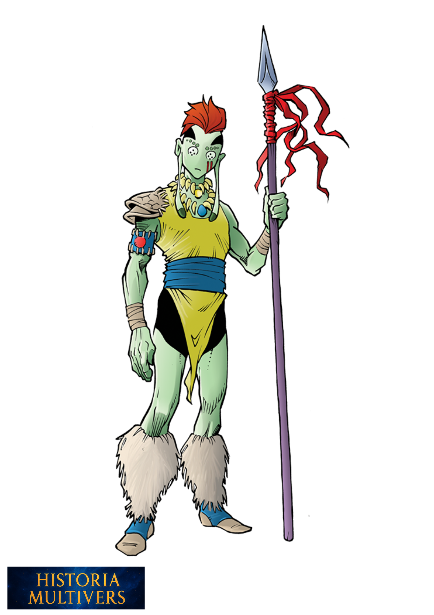 Porte une lance tribale décorée de rubans rouges, symbole de commandement militaire.
